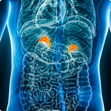 Adrenal glands sit on top of each kidney and consist of two parts: the inner part, the medulla, is surrounded by the outer layer, the adrenal cortex responsible for the secretion of important hormones that support vital organ functioning like 1,2,3
